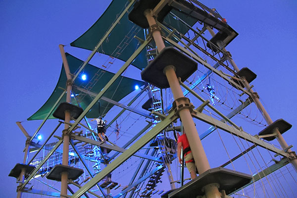 We dino double dare you to take the challenge on our Tree Top Challenge Ropes Course. With 5 increasingly difficult levels, climbers scale and make their way across the rope elements challenging balance, agility, and skill as they make their way up to the top to explore and experience breathtaking views of the Gulf, Park and Bay from over 60 feet in the air!